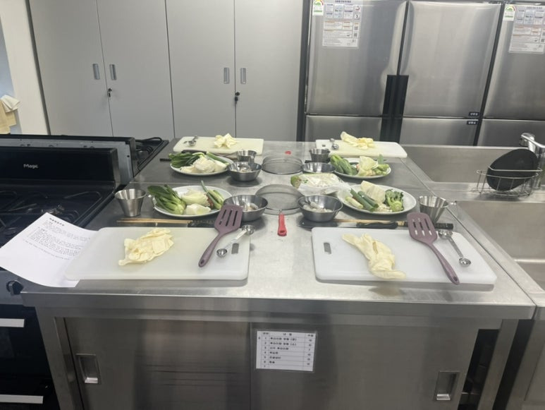 2인 1조로 한 테이블을 사용했고, 채소, 도마, 조리도구는 물론 개인별로 사용할 재료까지 깔끔하게 준비되어 있었습니다. 공통으로 사용하는 재료는 2~4인 기준으로 나누어 사용해 조리도 편리했어요.
